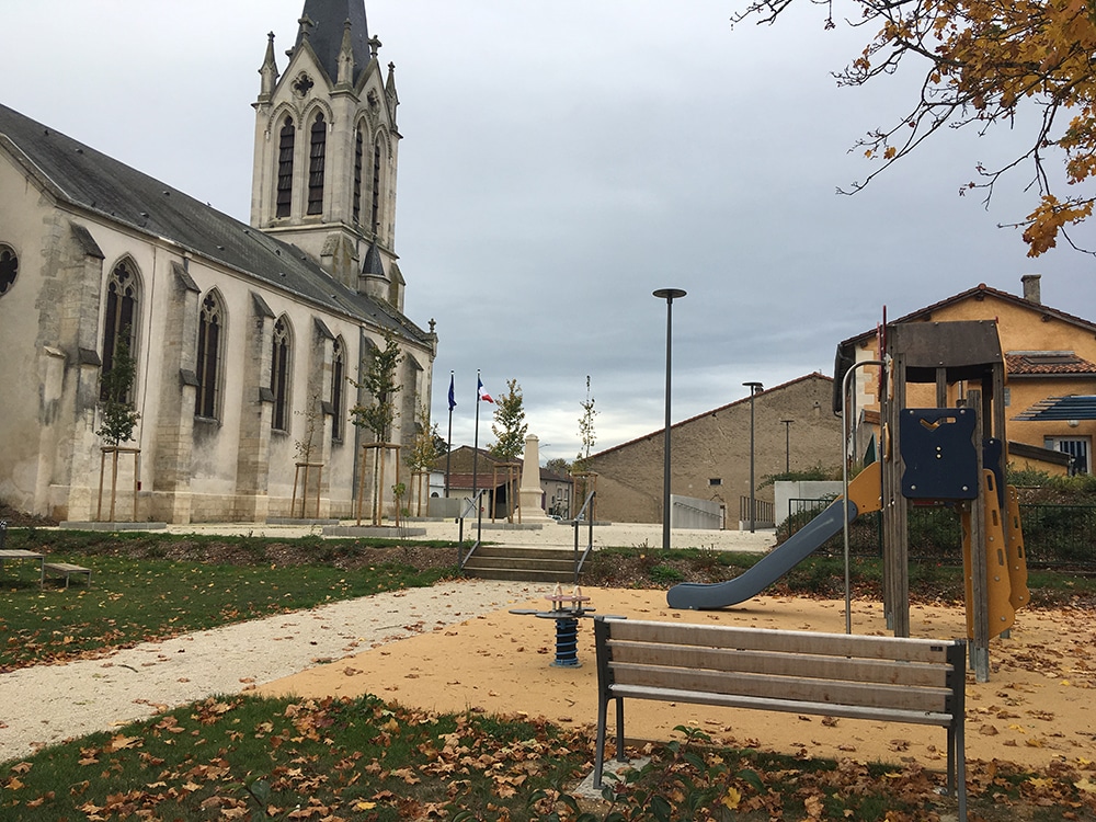 de la place centrale (l’église St Etienne, la salle et le logement communaux, l’arrêt de bus scolaire)